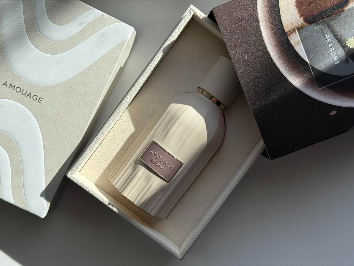 Amouage Reasons est un parfum boisé épicé unisexe lancé en 2024, issu de la gamme Essences d'Amouage. Connu pour son départ chaleureux de noisette, il évolue vers un cœur complexe de davana, ancré dans le fumé du palo santo. Composé à 30 % d'huiles de parfum pures, il est soumis à une double infusion en fûts de santal et de chêne, vieillis six mois. Ce procédé crée une expérience olfactive profonde et complexe, évoquant le passé et le présent, et incarnant une stabilité intemporelle, selon Perfume Dubai.