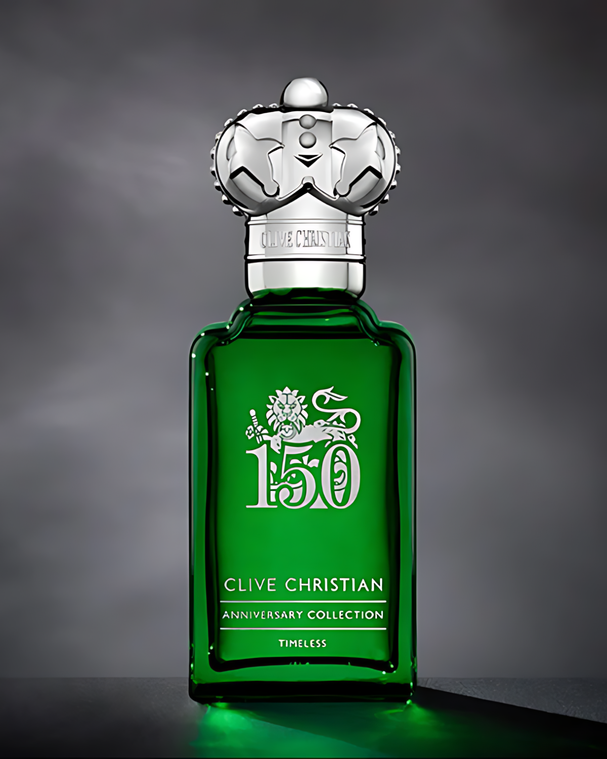 Le parfum contemporain 150e anniversaire de Clive Christian est une édition limitée célébrant le 150e anniversaire de la marque, un clin d'œil à son prédécesseur, The Crown Perfumery Company, fondée en 1872. Cette fragrance moderne et aromatique, aux notes fougères, allie tradition et innovation. Elle se compose de notes de tête de mûre, de sauge et de violette, de notes de cœur de cachemire, de géranium, de lavande, de muscade et de poivre, et de notes de fond d'ambre gris, de benjoin, de bois de cèdre, de géosmine, de mousse, de musc, de papyrus, de patchouli et de vétiver. Ce parfum est décrit comme un équilibre entre fraîcheur, épices et notes terreuses, avec un départ vibrant de mûre et de notes florales, un cœur boisé chaleureux et un fond terreux et enraciné.