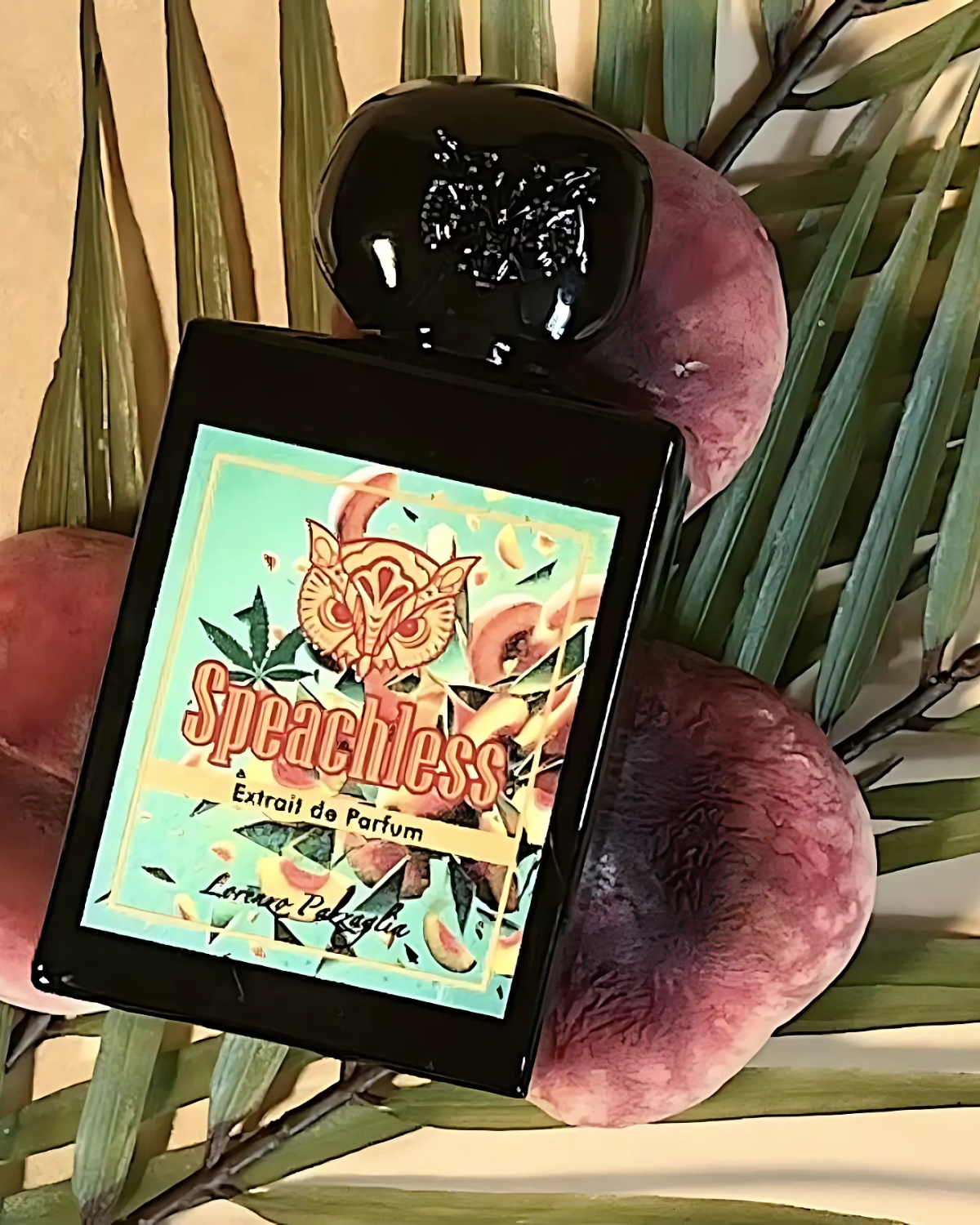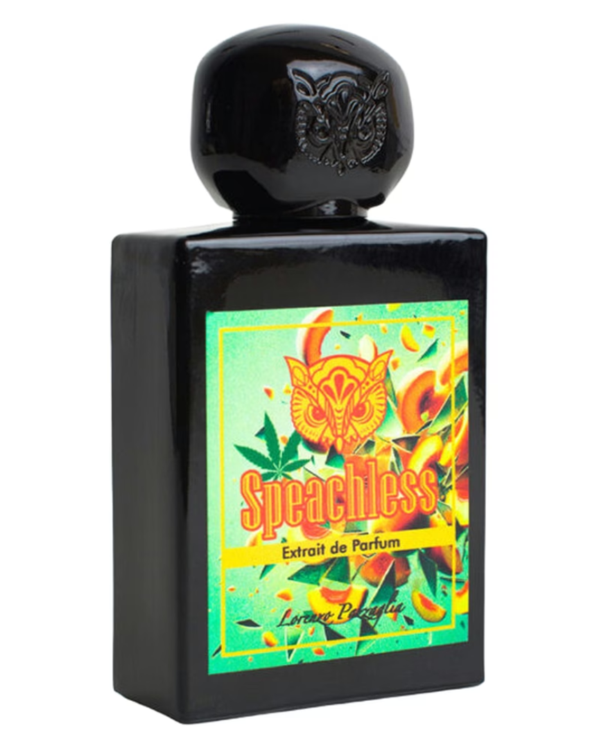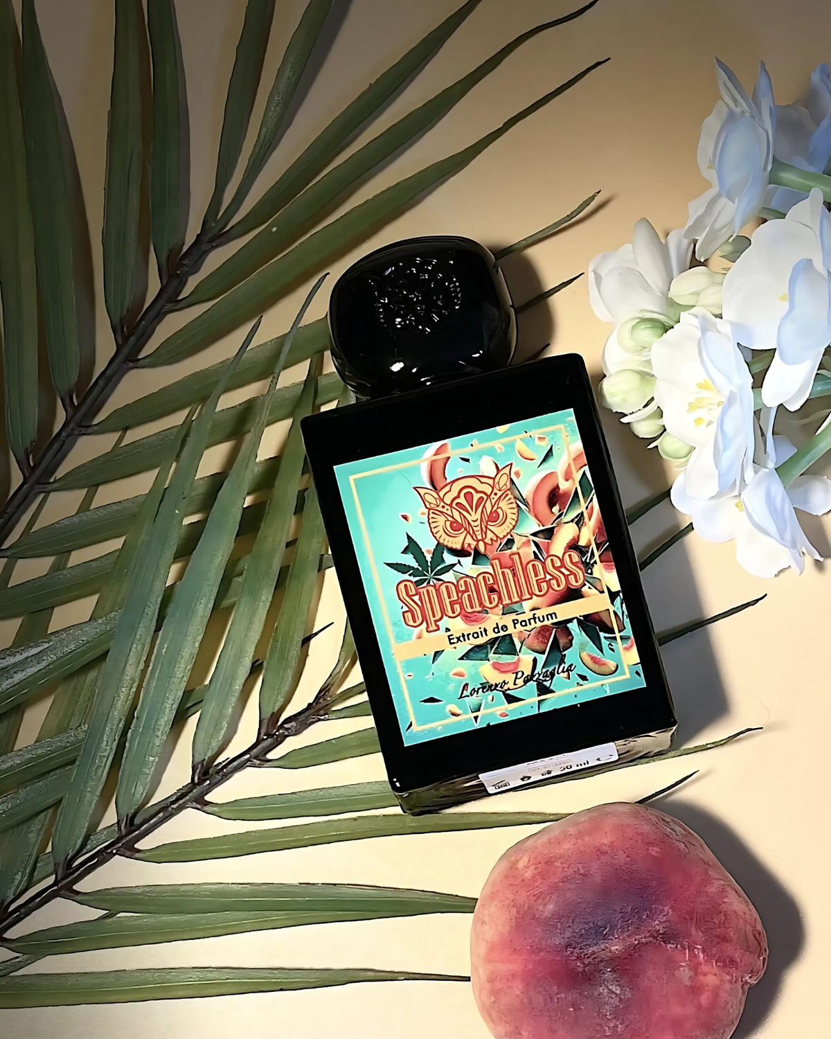 Speachless is an unisex Extrait de Parfum launched in 2025, described as a "pure rock" fragrance that is loud, daring, and impossible to ignore. It features a complex profile of citrus, juicy fruits like peach and lychee at the opening, a sophisticated floral heart with notes of jasmine and magnolia, and an earthy, woody base with a prominent cannabis note, patchouli, vetiver, and vanilla for a long-lasting and unique finish.