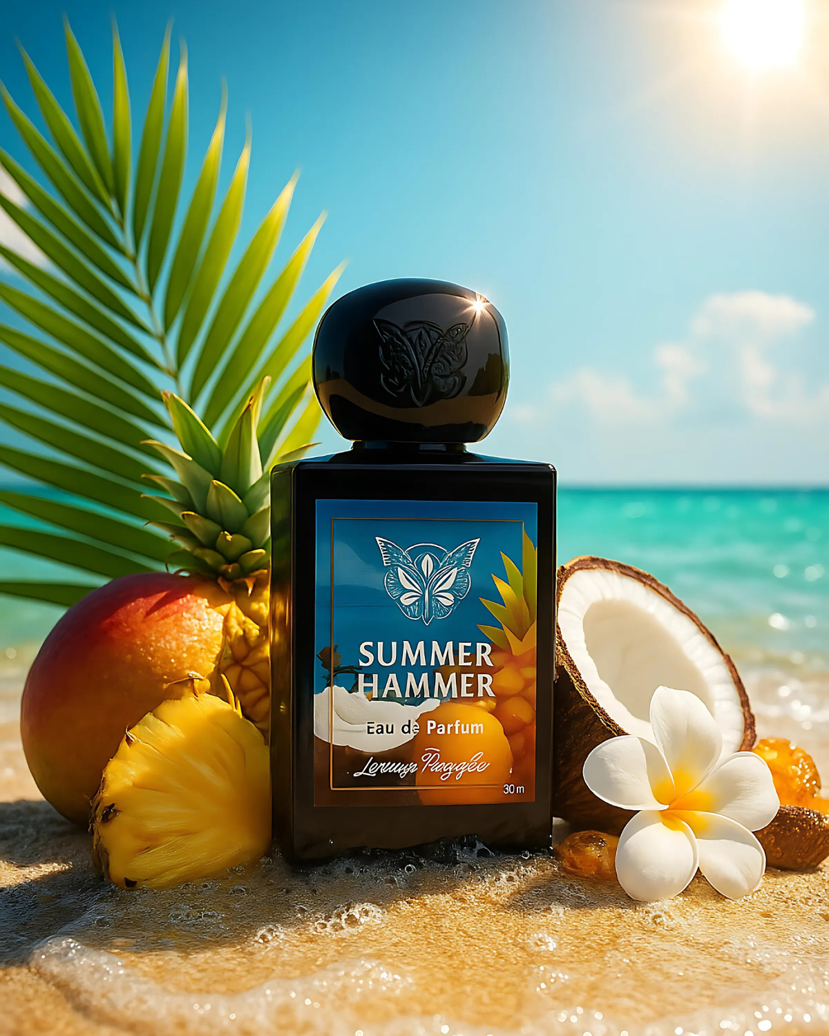 Summer Hammer is a unisex extrait de parfum launched in 2023 by Lorenzo Pazzaglia, designed to evoke happiness and a summer escape with its tropical, fruity, and slightly boozy scent profile. It features top notes of mango, pineapple, coconut, bergamot, and white rum, a heart of coconut milk, white flowers, and marine accords, and a base of musk, sandalwood, amber, and vetiver, creating a long-lasting fragrance with good performance.